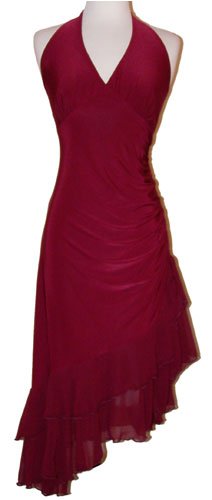 Stunning slinky stretch halter dress with party punch. Drawstring ruching on the hip, chiffon asymmetrical ruffles and ties. Junior sizes small, medium, large, 1X, 2X, 3X.